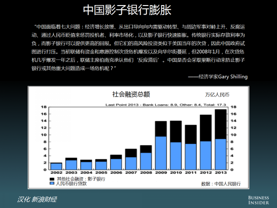 “中國面臨著七大問題:經濟增長放緩、從出口導向向內需驅動轉型、與周邊軍事對峙上升、反腐運動、通過人民幣貶值來懲罰投機者、利率市場化,以及影子銀行快速膨脹。傳統(tǒng)銀行實際存款利率為負,而影子銀行可以提供更高的回報。但它們的高風險投資類似于美國當年的次貸,因此中國政府試圖進行打壓。當初聯(lián)儲有資金和意愿控制次貸危機爆發(fā)以及向華爾街蔓延,但2008年1月,在次貸危機幾乎爆發(fā)一年之后,聯(lián)儲主席伯南克承認他們‘反應滯后’。中國是否會采取果斷行動來防止影子銀行或其他重大問題造成一場危機呢?”——經濟學家Gary