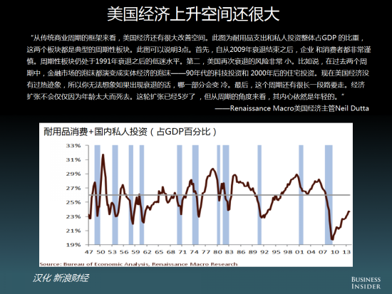 “從傳統(tǒng)商業(yè)周期的框架來看,美國經濟還有很大改善空間。此圖為耐用品支出和私人投資整體占GDP的比重,這兩個板塊都是典型的周期性板塊。此圖可以說明3點。首先,自從2009年衰退結束之后,企業(yè)和消費者都非常謹慎。周期性板塊仍處于1991年衰退之后的低迷水平。第二,美國再次衰退的風險非常小。比如說,在過去兩個周期中,金融市場的泡沫都演變成實體經濟的泡沫——90年代的科技投資和2000年后的住宅投資,F(xiàn)在美國經濟沒有過熱跡象,所以你無法想象如果出現(xiàn)衰退的話,哪一部分會變冷。最后,這個周期還有很長一段路要走。經濟擴張不會僅僅因為年齡太大而死去。這輪擴張已經5歲了,但從周期的角度來看,其內心依然是年輕的!薄猂enaissance