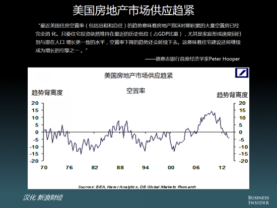 “最近美國住房空置率(包括出租和自住)的趨勢意味著房地產泡沫時期積累的大量空置房已經完全消化。只要住宅投資依然維持在最近的歷史低位(占GDP比重),尤其是家庭形成速度回歸到與潛在人口增長更一致的水平,空置率下降的趨勢還會延續(xù)下去。這意味著住宅建設還將繼續(xù)成為增長的引擎之一!薄乱庵俱y行首席經濟學家Peter