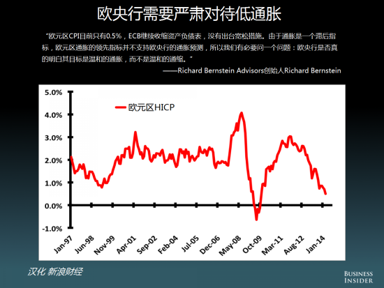“歐元區(qū)CPI目前只有0.5%,ECB繼續(xù)收縮資產負債表,沒有出臺寬松措施。由于通脹是一個滯后指標,歐元區(qū)通脹的領先指標并不支持歐央行的通脹預測,所以我們有必要問一個問題:歐央行是否真的明白其目標是溫和的通脹,而不是溫和的通縮!薄猂ichard