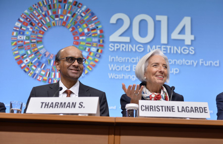 4月12日,在美國首都華盛頓,國際貨幣基金組織(IMF)決策機構(gòu)——國際貨幣與金融委員會呼吁各國在全球經(jīng)濟復蘇勢頭上升但依然不夠強勁的背景下,通過結(jié)構(gòu)性改革等措施保持增長。 圖為當日國際貨幣與金融委員會主席、新加坡副總理兼財政部長尚達曼(左)和國際貨幣基金組織(IMF)總裁拉加德出席新聞發(fā)布會。