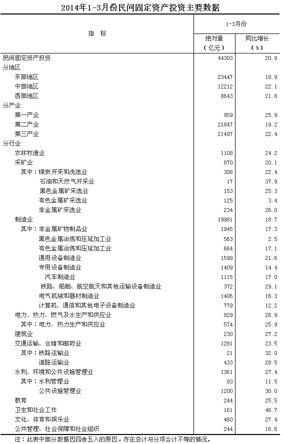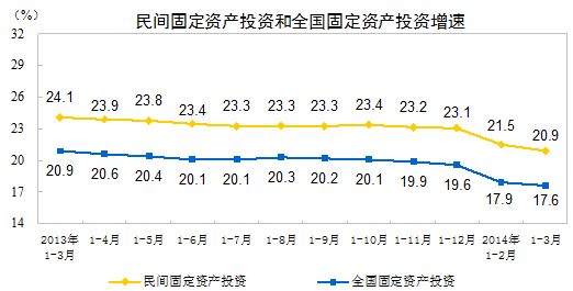 2014年1-3月份,民間固定資產(chǎn)投資44303億元,同比名義增長20.9%(扣除價格因素實際增長19.6%),增速比1-2月份回落0.6個百分點。民間固定資產(chǎn)投資占全國固定資產(chǎn)投資(不含農(nóng)戶)的比重為64.8%。