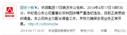 華潤集團17日晚發(fā)布公告稱,2014年4月17日18時30分,中紀委公布公司董事長宋林因涉嫌嚴重違紀違法,目前正接受組織調查。本公司將全力配合調查工作,并努力確保各項業(yè)務正常開展。