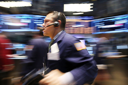 圖為交易員在美國(guó)紐約證券交易所忙碌。