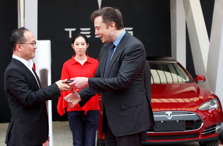 4月23日,特斯拉公司首席執(zhí)行官埃隆·馬斯克(右)向車主交付Model S型全電動汽車新車。 當日,美國電動汽車生產(chǎn)商特斯拉汽車公司在上海金橋開發(fā)區(qū)舉辦首批7輛新車交付儀式,新建的超級充電站也同期亮相(小圖)。據(jù)介紹,位于上海金橋的超級充電站是特斯拉在中國區(qū)域興建的第一個超級充電站。