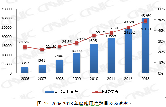 截至2013年12月,我國網(wǎng)絡(luò)購物用戶規(guī)模達(dá)到3.02億,較上年增加5987萬,增長率為24.7%,使用率從42.9%提升至48.9%。網(wǎng)購用戶規(guī)模的快速擴(kuò)張為網(wǎng)購市場的發(fā)展奠定良好的用戶基礎(chǔ),釋放著巨大的市場潛力。