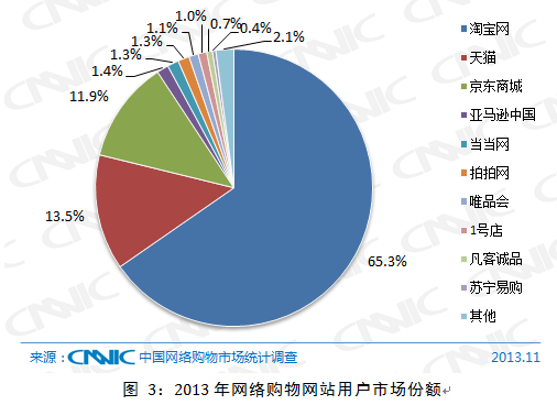 淘寶網(wǎng)、天貓、京東商城的用戶份額在網(wǎng)購市場排名前三,占據(jù)90.7%的用戶市場。其中,淘寶網(wǎng)占據(jù)65.3%的用戶市場份額,天貓占據(jù)13.5%的用戶市