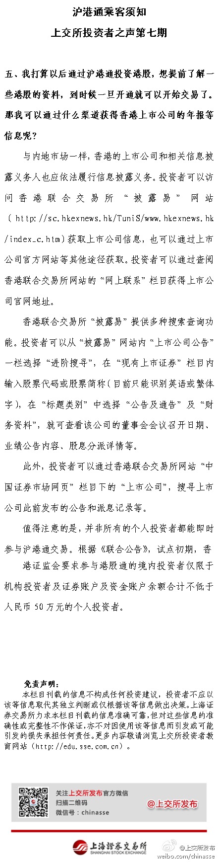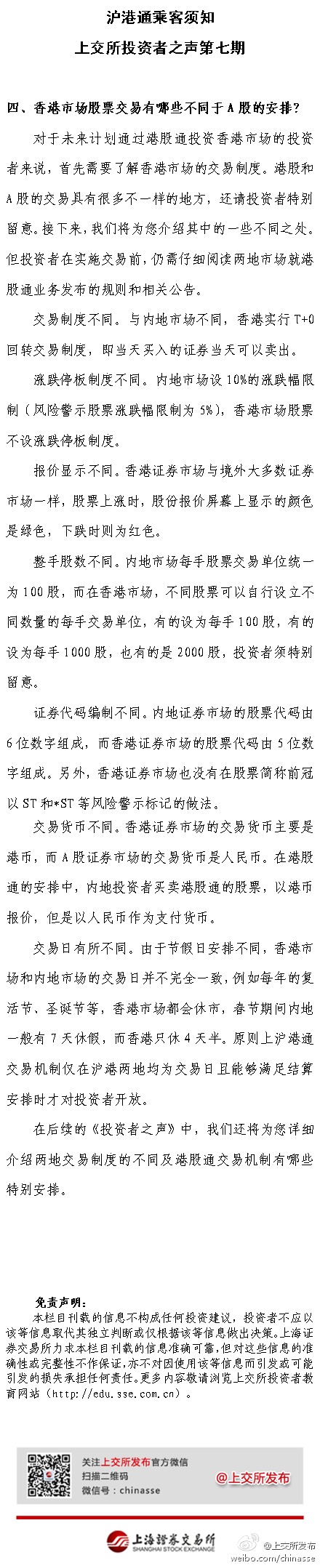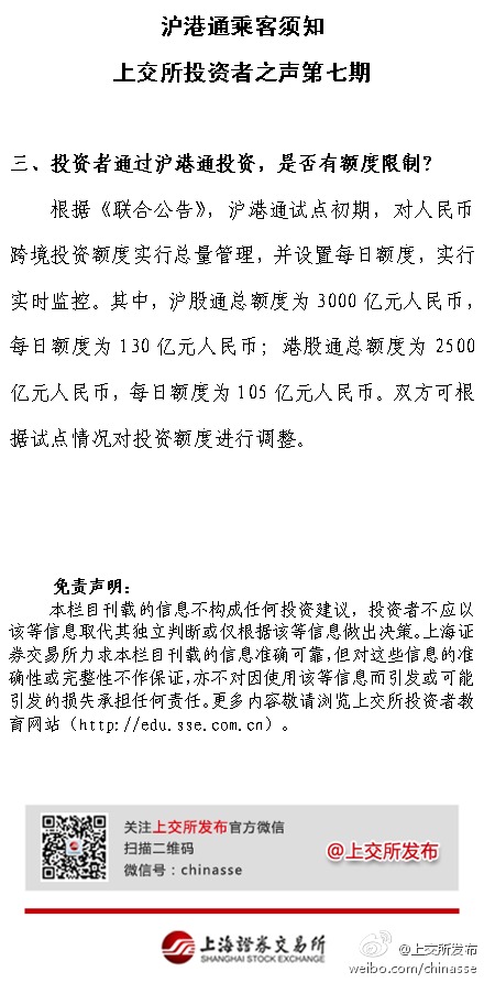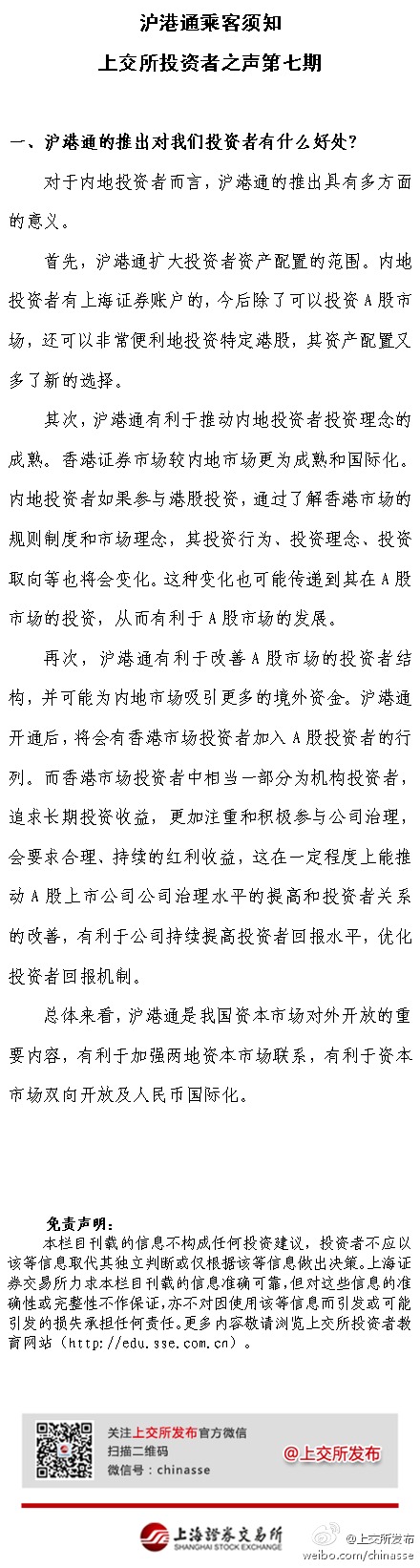 針對(duì)“滬港通的推出對(duì)我們投資者有什么好處?”的問(wèn)題,上交所在微博上回應(yīng):滬港通是我國(guó)資本市場(chǎng)對(duì)外開(kāi)放的重要內(nèi)容,有利于加強(qiáng)兩地資本市場(chǎng)聯(lián)系,有利于資本市場(chǎng)雙向開(kāi)放及人民幣國(guó)際化,可能為內(nèi)地市場(chǎng)吸引更多的境外資金。
