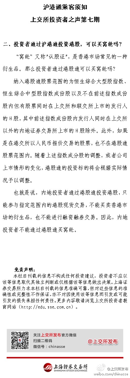 針對(duì)“投資者通過(guò)滬港通投資港股,可以買(mǎi)窩輪嗎?”的問(wèn)題,上交所今日在微博上回應(yīng):內(nèi)地投資者不能通過(guò)港股通買(mǎi)“窩輪”。
