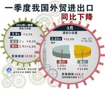 此前海關(guān)總署發(fā)布的一季度數(shù)據(jù)顯示,2014年一季度,中國進(jìn)出口總額9659億美元,同比下降1%。其中,出口下降3.4%,進(jìn)口增長1.6%;貿(mào)易順差下降59.8%。