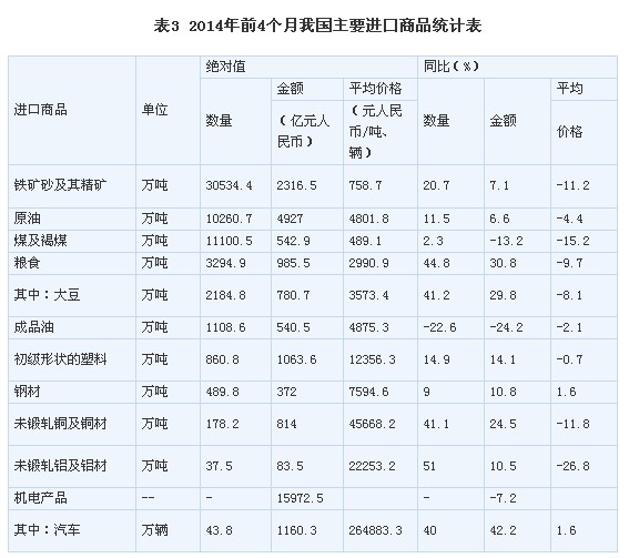 六、在進(jìn)口商品中,主要大宗商品進(jìn)口量增加,進(jìn)口均價(jià)普遍下跌。前4個(gè)月,我國(guó)進(jìn)口鐵礦砂3.05億噸,增加20.7%,進(jìn)口均價(jià)為每噸758.7元,下跌11.2%;原油1.03億噸,增加11.5%,進(jìn)口均價(jià)為每噸4801.8元,下跌4.4%;煤1.1億噸,增加2.3%,進(jìn)口均價(jià)為每噸489.1元,下跌15.2%;糧食3294.9萬(wàn)噸,增加44.8%;其中大豆2184.8萬(wàn)噸,增加41.2%,進(jìn)口均價(jià)為每噸3573.4元,下跌8.1%;成品油1108.6萬(wàn)噸,減少22.6%,進(jìn)口均價(jià)為每噸4875.3元,下跌2.1%;初級(jí)形狀的塑料860.8萬(wàn)噸,增加14.9%,進(jìn)口均價(jià)為每噸1.24萬(wàn)元,下跌0.7%;鋼材489.8萬(wàn)噸,增加9%,進(jìn)口均價(jià)為每噸7594.6元,上漲1.6%;未鍛造銅及銅材178.2萬(wàn)噸,增加41.1%,進(jìn)口均價(jià)為每噸4.57萬(wàn)元,下跌11.8%;未鍛造鋁及鋁材37.5萬(wàn)噸,增加51%,進(jìn)口均價(jià)為每噸2.23萬(wàn)元,下跌26.8%。此外,機(jī)電產(chǎn)品進(jìn)口1.6萬(wàn)億元,下降7.2%;其中汽車43.8萬(wàn)輛,增加40%(表3)。