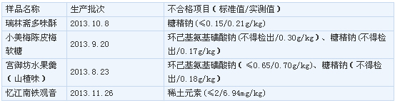 本次通報(bào)有“瑞林齋”牌多味酥等4種不合格食品表。其中,“小美梅”牌陳皮梅軟糖測(cè)出了甜蜜素和糖精鈉的成分。