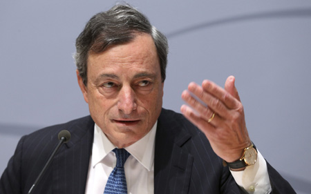 歐洲央行8日公布5月份利率決議,將關(guān)鍵再融資利率維持在0.25%的紀(jì)錄低位,符合市場預(yù)期。歐洲央行行長德拉吉表示,歐元區(qū)繼續(xù)溫和復(fù)蘇,通脹壓力有所抑制,歐洲央行將在很長一段時間內(nèi)維持低利率水平。歐洲央行對下個月在歐元區(qū)放寬貨幣政策一事持開放態(tài)度。 圖為德拉吉當(dāng)日在布魯塞爾出席貨幣政策會議結(jié)束后的新聞發(fā)布會。