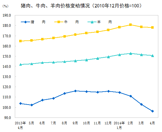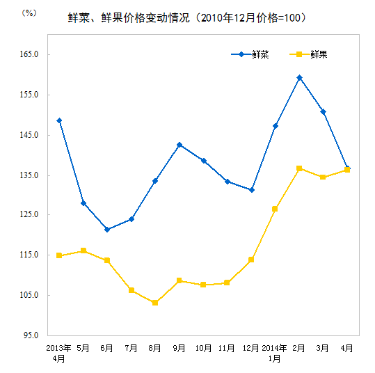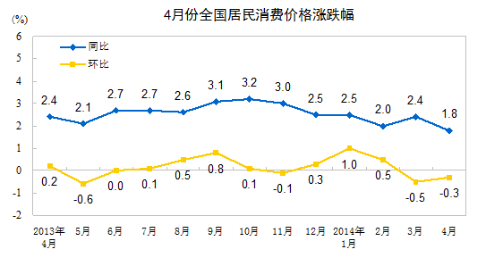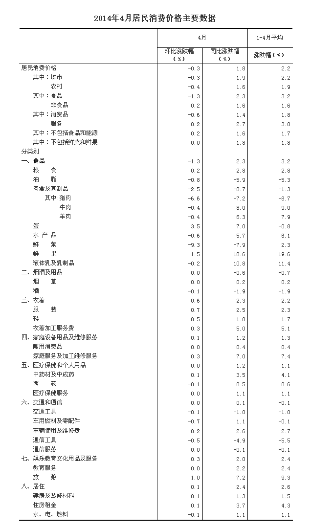 2014年4月份,全國居民消費價格總水平同比上漲1.8%。其中,城市上漲1.9%,農(nóng)村上漲1.6%;食品價格上漲2.3%,非食品價格上漲1.6%;消費品價格上漲1.4%,服務(wù)價格上漲2.7%。1-4月平均,全國居民消費價格總水平比去年同期上漲2.2%。