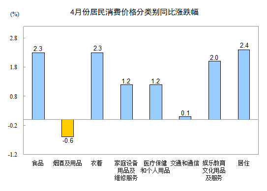 4月份,非食品價格環(huán)比上漲0.2%。其中,衣著、娛樂教育文化用品及服務(wù)、家庭設(shè)備用品及維修服務(wù)、居住價格分別上漲0.6%、0.3%、0.1%和0.1%;煙酒及用品、醫(yī)療保健和個人用品、交通和通信價格持平(漲跌幅度為0)。