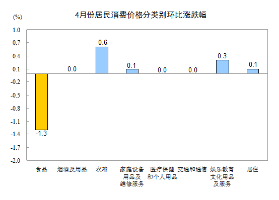 4月份,全國居民消費價格總水平環(huán)比下降0.3%。其中,城市下降0.3%,農(nóng)村下降0.4%;食品價格下降1.3%,非食品價格上漲0.2%;消費品價格下降0.6%,服務(wù)價格上漲0.2%。