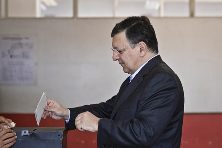 25日,歐盟委員會主席巴羅佐在里斯本一個投票站內(nèi)投票。22日至25日,《里斯本條約》施行后首次歐洲議會選舉在歐盟28個成員國舉行,選舉結(jié)果將于全部成員國投票結(jié)束后,于布魯塞爾當(dāng)?shù)貢r間25日深夜公布。