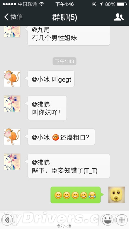“小冰”集合了中國(guó)近七億網(wǎng)民多年來(lái)積累的全部公開(kāi)聊天記錄,并從中精煉出1500萬(wàn)條語(yǔ)料庫(kù),同時(shí)可以通過(guò)上下文語(yǔ)境來(lái)給與回應(yīng),已經(jīng)可以相當(dāng)于16歲少女的智商。目前,小冰已經(jīng)開(kāi)始測(cè)試,你可以將她加到微信群中聊天。