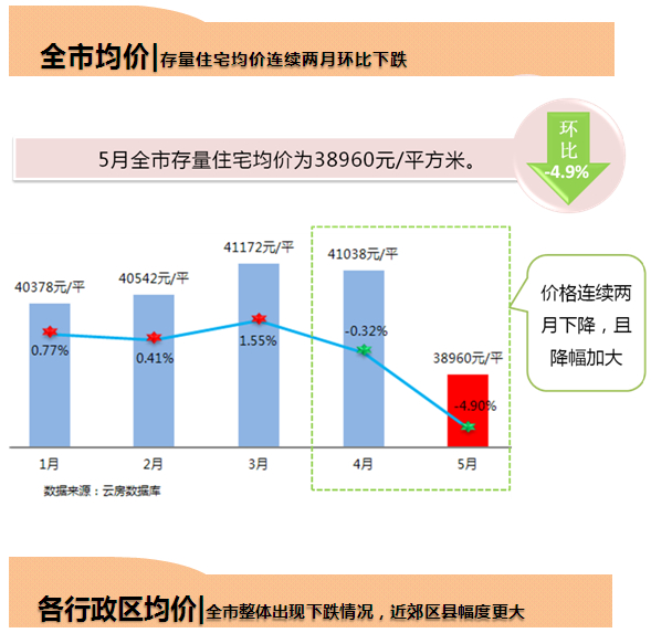 近日,北京云房數(shù)據(jù)市場(chǎng)研究部發(fā)布5月全市存量房住宅價(jià)格更新結(jié)果,數(shù)據(jù)顯示,5月北京市存量住宅平均價(jià)格為38960元/平方米,環(huán)比上月下跌4.9%。當(dāng)月二手房住宅市場(chǎng),由于新增房源、掛牌價(jià)降幅、議價(jià)空間等多項(xiàng)指標(biāo)均為年內(nèi)較高水平,使得北京二手住宅市場(chǎng)逐步由賣方市場(chǎng)變?yōu)橘I方市場(chǎng)。另一方面,由于受到自住房及信貸政策的影響,購(gòu)房者觀望情緒嚴(yán)重,入市不積極,使得剛需購(gòu)房的主要區(qū)域(即近郊區(qū))的成交量受到明顯影響。