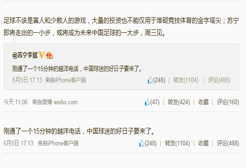 消息面,傳聞稱蘇寧即將牽手國外豪門俱樂部巴薩,進(jìn)軍足球行業(yè)。今日蘇寧云商(002024)副總裁、運(yùn)營總部執(zhí)行總裁李斌發(fā)布相關(guān)微博表示,“足球不該是富人和少數(shù)人的游戲,大量的投資也不能僅用于堆砌競技體育的金字塔尖;蘇寧即將走出的一小步,或?qū)⒊蔀槲磥碇袊闱虻囊淮蟛,周三見”。同時(shí),有網(wǎng)友發(fā)現(xiàn),地鐵站到處充滿著巴薩球星宣傳畫,結(jié)果是蘇寧廣告。