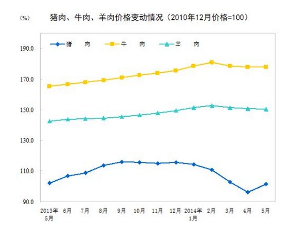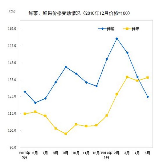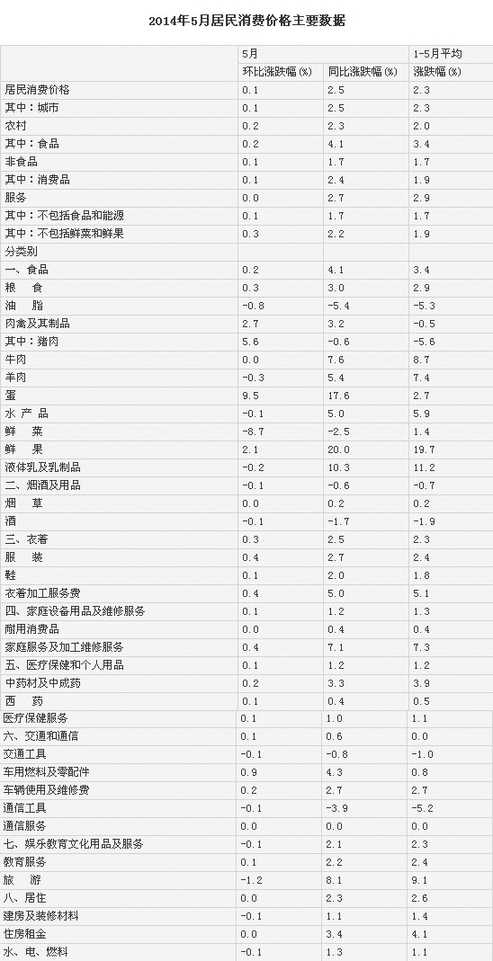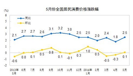 2014年5月份,全國(guó)居民消費(fèi)價(jià)格總水平同比上漲2.5%。其中,城市上漲2.5%,農(nóng)村上漲2.3%;食品價(jià)格上漲4.1%,非食品價(jià)格上漲1.7%;消費(fèi)品價(jià)格上漲2.4%,服務(wù)價(jià)格上漲2.7%。1-5月平均,全國(guó)居民消費(fèi)價(jià)格總水平比去年同期上漲2.3%。