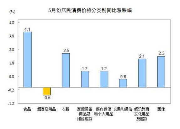 5月份,食品價(jià)格同比上漲4.1%,影響居民消費(fèi)價(jià)格總水平上漲約1.35個(gè)百分點(diǎn)。其中,鮮果價(jià)格上漲20.0%,影響居民消費(fèi)價(jià)格總水平上漲約0.43個(gè)百分點(diǎn);水產(chǎn)品價(jià)格上漲5.0%,影響居民消費(fèi)價(jià)格總水平上漲約0.13個(gè)百分點(diǎn);肉禽及其制品價(jià)格上漲3.2%,影響居民消費(fèi)價(jià)格總水平上漲約0.23個(gè)百分點(diǎn)(豬肉價(jià)格下降0.6%,影響居民消費(fèi)價(jià)格總水平下降約0.02個(gè)百分點(diǎn));糧食價(jià)格上漲3.0%,影響居民消費(fèi)價(jià)格總水平上漲約0.09個(gè)百分點(diǎn);鮮菜價(jià)格下降2.5%,影響居民消費(fèi)價(jià)格總水平下降約0.08個(gè)百分點(diǎn)。