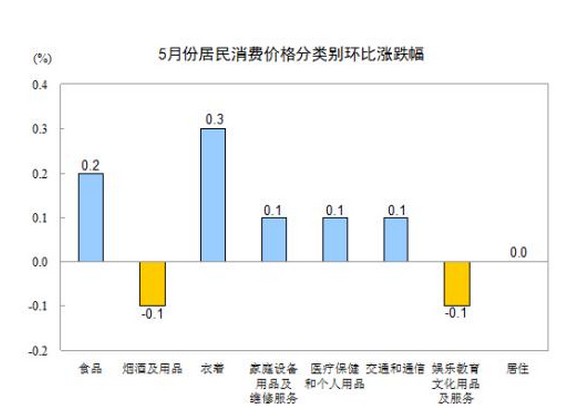 5月份,全國(guó)居民消費(fèi)價(jià)格總水平環(huán)比上漲0.1%。其中,城市上漲0.1%,農(nóng)村上漲0.2%;食品價(jià)格上漲0.2%,非食品價(jià)格上漲0.1%;消費(fèi)品價(jià)格上漲0.1%,服務(wù)價(jià)格持平(漲跌幅度為0,下同)。