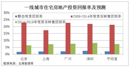 未來五年,一線城市房價(jià)理性回歸,或結(jié)束住宅投資黃金時(shí)代。從目前的情況來看,一方面,中國經(jīng)濟(jì)增長正處于“切換”過程中,從原來10%左右的高速增長,下調(diào)到中高速或中速水平。宏觀經(jīng)濟(jì)增長放緩,經(jīng)濟(jì)基本面難以支撐房價(jià)高位上漲。另一方面,北京、深圳等主要城市持續(xù)快速攀升的價(jià)格顯然已經(jīng)成為中央深化地產(chǎn)調(diào)控政策的重點(diǎn)。隨著2014年房地產(chǎn)信貸的加緊收縮、銀行加息,以及未來不動(dòng)產(chǎn)登記、房產(chǎn)稅征收問題的解決,未來幾年里,一線城市房產(chǎn)市場將在市場規(guī)律主導(dǎo)下從超速增長轉(zhuǎn)向平穩(wěn)增長!2014年上半年中國房地產(chǎn)投資回報(bào)率研究》預(yù)測結(jié)果顯示,一線城市未來5年租賃后轉(zhuǎn)售回報(bào)率平均值為7.3%,與歷史5年租賃后轉(zhuǎn)售回報(bào)率平均值21.3%相比,降幅非常明顯,表現(xiàn)出明顯的去投資化趨勢,一線城市住宅投資黃金時(shí)代正悄悄落幕。