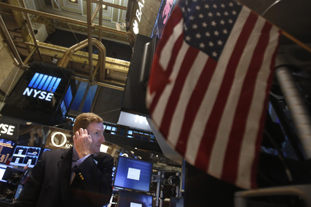 受外圍市場上漲提振,紐約股市三大股指9日上漲,其中道瓊斯工業(yè)平均指數(shù)和標(biāo)普500指數(shù)再創(chuàng)新高。截至當(dāng)天收盤,道瓊斯工業(yè)平均指數(shù)比前一個交易日漲18.82點(diǎn),收于16943.10點(diǎn),漲幅為0.11%。標(biāo)準(zhǔn)普爾500種股票指數(shù)漲1.83點(diǎn),收于1951.27點(diǎn),漲幅為0.09%。圖為一名交易員9日在美國紐約證券交易所內(nèi)工作。