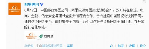 6月12日,中國郵政集團公司與阿里巴巴集團達成戰(zhàn)略合作。雙方將在物流、電商、金融、信息安全等領域全面開展深度合作,合力建設中國智能物流骨干網。通過這個網絡平臺,郵政覆蓋全國超十萬個網點將與菜鳥網絡全面打通,并開放給社會化物流。