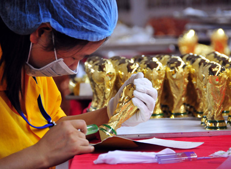 萬眾矚目的巴西世界杯足球賽于北京時間13日凌晨開幕,32支球隊將為了“大力神杯”捉對廝殺一個月。而球場外的“大力神杯”紀念品,則主要來自中國。東莞煒光禮品有限公司獲得國際足聯(lián)(FIFA)的授權(quán),生產(chǎn)高度從25mm到150mm的2014年巴西世界杯“大力神杯”紀念品。這些大大小小的“大力神杯”銷售范圍包括中國、日本、美國等16個國家和地區(qū)。
