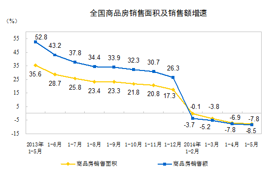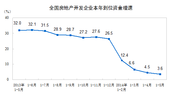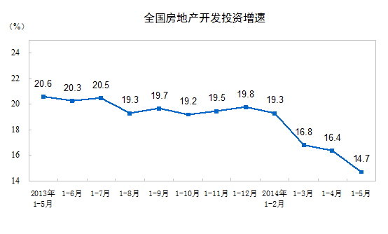 2014年1-5月份,全國房地產開發(fā)投資30739億元,同比名義增長14.7%,增速比1-4月份回落1.7個百分點。其中,住宅投資21043億元,增長14.6%,增速回落2個百分點,占房地產開發(fā)投資的比重為68.5%。