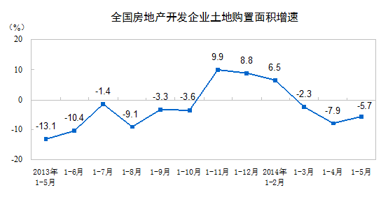 1-5月份,房地產開發(fā)企業(yè)土地購置面積11090萬平方米,同比下降5.7%,降幅比1-4月份收窄2.2個百分點;土地成交價款2954億元,增長8.7%,增速回落0.9個百分點。