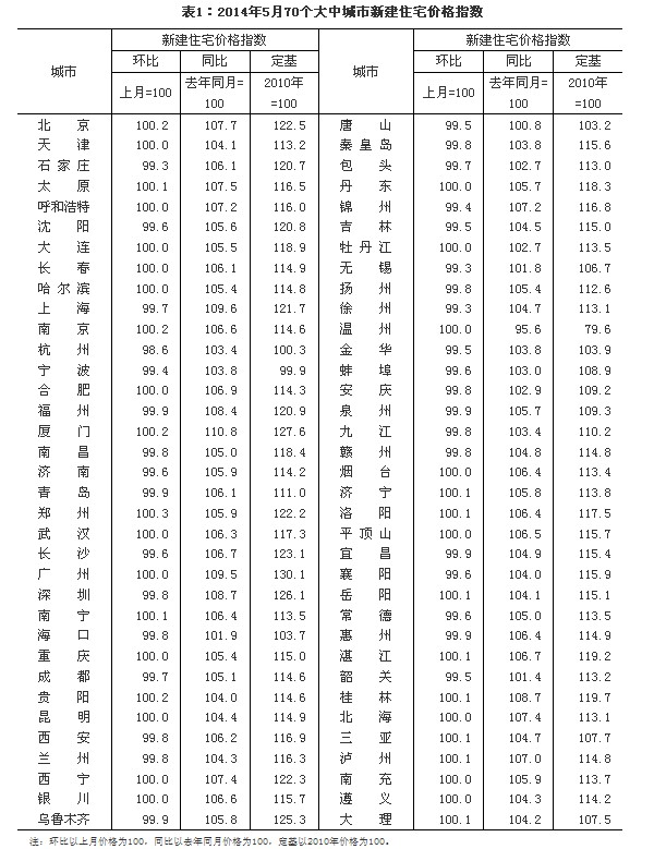 國家統(tǒng)計(jì)局今日公布5月70個(gè)大中城市住宅銷售價(jià)格報(bào)告。數(shù)據(jù)顯示,與上月相比,70個(gè)大中城市中,價(jià)格下降的城市有35個(gè),持平的城市有20個(gè),上漲的城市有15個(gè)。與去年同月相比,70個(gè)大中城市中,價(jià)格下降的城市有1個(gè),上漲的城市有69個(gè)。