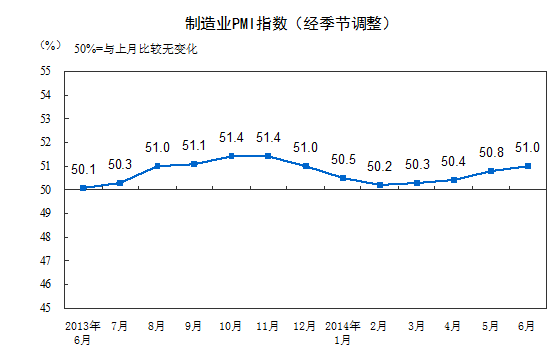 2014年7月1日國家統(tǒng)計局服務業(yè)調(diào)查中心和中國物流與采購聯(lián)合會發(fā)布的中國制造業(yè)采購經(jīng)理指數(shù)顯示,2014年6月中國制造業(yè)PMI為51.0%,比上月上升0.2個百分點,連續(xù)4個月回升,表明我國制造業(yè)繼續(xù)保持平穩(wěn)向好的態(tài)勢。