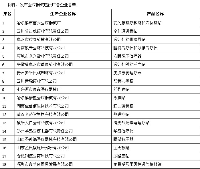 根據(jù)醫(yī)療器械違法廣告監(jiān)測情況,總局稽查局從2013年度刊播嚴(yán)重違法廣告且2014年第一季度仍繼續(xù)刊播,并且次數(shù)較高的違法廣告中,篩選出了違法情節(jié)嚴(yán)重的20個醫(yī)療器械產(chǎn)品,涉及18家企業(yè)。