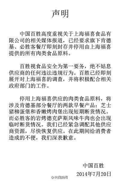 央視新聞【百勝集團(tuán)回應(yīng):封存停用涉事原料】針對供應(yīng)商提供問題原料被曝光一事,肯德基、必勝客所屬的百勝餐飲集團(tuán)回應(yīng):即刻封存并停用由上海福喜提供的所有肉類食品原料。因停用上海福喜供應(yīng)原料造成三款產(chǎn)品出現(xiàn)臨時斷貨,已緊急調(diào)配其他供應(yīng)商資源。