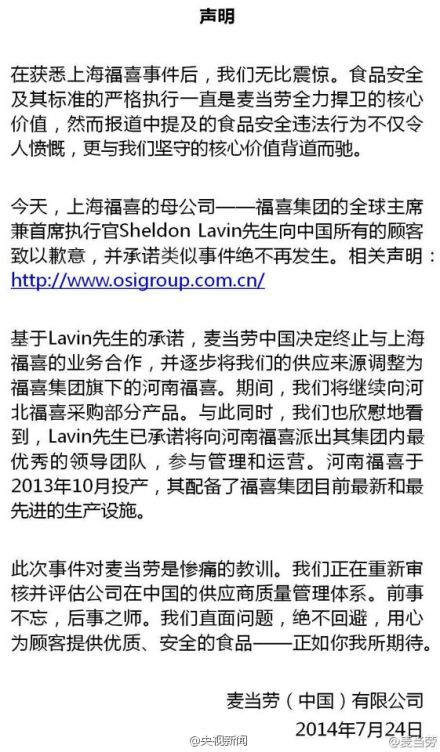 @央視新聞:#麥當勞肯德基供應商被曝光#【麥當勞終止與上海福喜的合作】@麥當勞 今晨發(fā)布聲明稱,上海福喜母公司福喜集團全球主席兼首席執(zhí)行官向中國所有顧客致歉,并承諾類似事件絕不發(fā)生。基于其承諾,麥當勞中國決定終止與上海福喜的業(yè)務合作,并將供應來源調(diào)整為福喜旗下的河南福喜。(央視記者陳雯 王殿甲)