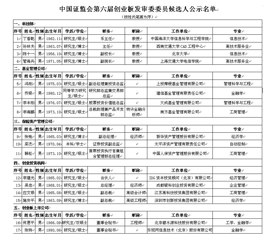 根據(jù)《中國(guó)證券監(jiān)督管理委員會(huì)發(fā)行審核委員會(huì)辦法》(證監(jiān)會(huì)令第62號(hào)),第五屆創(chuàng)業(yè)板發(fā)審委將于近期屆滿。我會(huì)決定對(duì)委員進(jìn)行部分更換。各單位依程序向我會(huì)推薦了17名委員候選人,F(xiàn)將第六屆創(chuàng)業(yè)板發(fā)審委17名委員候選人名單予以公示(詳見(jiàn)附件)。