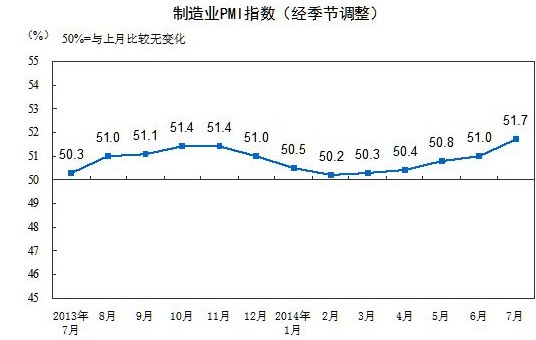 中國物流與采購聯(lián)合會、國家統(tǒng)計局服務(wù)業(yè)調(diào)查中心發(fā)布的2014年7月份中國制造業(yè)采購經(jīng)理指數(shù)(PMI)為51.7%,比上月上升0.7個百分點。從12個分項指數(shù)來看,同上月相比,除從業(yè)人員和供應(yīng)商配送時間指數(shù)回落外,其它各項指數(shù)均呈現(xiàn)回升。其中,生產(chǎn)量指數(shù)回升幅度最大,升幅為1.2個百分點;采購量和原材料庫存指數(shù)均回升1個百分點;其余新訂單、新出口訂單、購進價格以及產(chǎn)成品庫存指數(shù)等環(huán)比升幅均在1個百分點以內(nèi)。