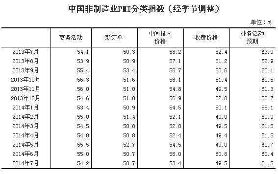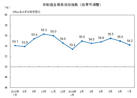 2014年7月,中國非制造業(yè)商務(wù)活動指數(shù)為54.2%,雖比上月回落0.8個百分點,但仍高于榮枯線4.2個百分點。