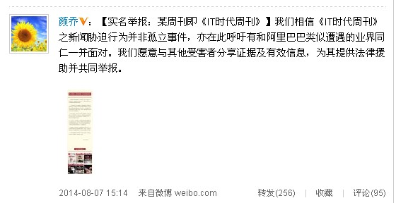 顏喬通過微博表示,“我們相信《IT時代周刊》之新聞脅迫行為并非孤立事件,亦在此呼吁有和阿里巴巴類似遭遇的業(yè)界同仁一并面對。我們愿意與其他受害者分享證據(jù)及有效信息,為其提供法律援助并共同舉報!