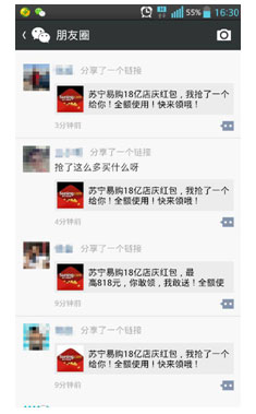 分析人士表示,蘇寧易購開發(fā)的微信紅包有著社交化分享、病毒式擴散和普惠性收益等特征,不僅僅是蘇寧易購對廣大消費者的回饋,也是朋友之間良好的互動方式,蘇寧的紅包成為了朋友之間一次社交互動的紐帶。在紅包一“發(fā)”一“搶”之間,搶紅包活動呈現(xiàn)“病毒式”的擴散,短短時間內(nèi)朋友圈盡被刷屏?梢哉f,這是一次成功的社交化營銷。該分析人士強調(diào),此次蘇寧易購的微信紅包還具有共享的獨特性,用戶發(fā)出去的紅包被朋友搶完后,發(fā)紅包的用戶也會獲得群紅包內(nèi)同等金額的紅包,真是“贈人玫瑰,手有余香”生動寫照。