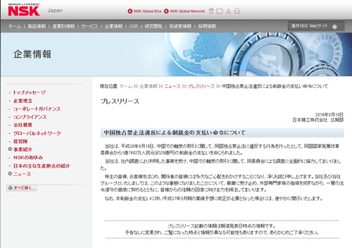 日本精工株式會(huì)社就因違反中國(guó)反壟斷法受罰發(fā)出的企業(yè)公告