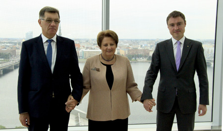 8月23日,在拉脫維亞首都里加,立陶宛總理布特克維丘斯(左)、拉脫維亞總理斯特勞尤馬(中)和愛沙尼亞總理羅伊瓦斯攜手合影。