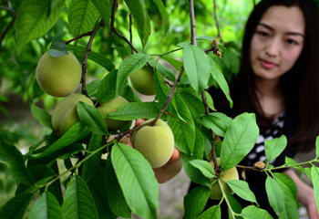 | 隴南市武都區(qū),一名科技人員正在查看“水果村”里的水果長勢 |