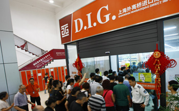位于上海外高橋的進(jìn)口商品直銷中心在上午十點(diǎn)開門時(shí),市民涌進(jìn)入口處!