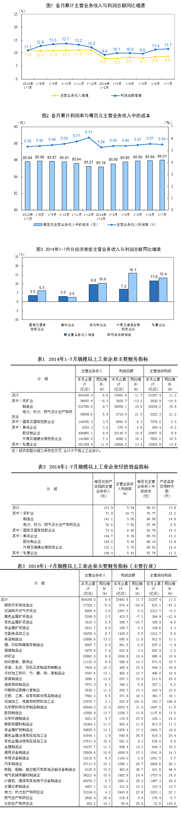 何平指出,1-7月份工業(yè)利潤保持平穩(wěn)較快增長的主要原因,一是隨著國家一系列“穩(wěn)增長”政策的實(shí)施,企業(yè)銷售保持穩(wěn)定增長。1-7月份,規(guī)模以上工業(yè)企業(yè)主營業(yè)務(wù)收入同比增長8.8%,增速比上半年提高0.2個(gè)百分點(diǎn)。二是成本費(fèi)用上升勢頭有所抑制。1-7月份,企業(yè)主營業(yè)務(wù)成本同比增長9%,增速與上半年持平;每百元主營業(yè)務(wù)收入中的成本為86.01元,同比增加0.22元,比上半年少增加0.14元。每百元主營業(yè)務(wù)收入中的期間費(fèi)用合計(jì)為7.14元,為今年以來最低水平,同比增加0.11元,比上半年少增加0.03元。三是主要原材料等上游產(chǎn)品價(jià)格持續(xù)回落,為中下游企業(yè)創(chuàng)造了盈利空間。四是新增利潤依賴于少數(shù)行業(yè)的現(xiàn)象有所緩解。1-7月份,汽車制造業(yè)、電力熱力生產(chǎn)和供應(yīng)業(yè)等新增利潤較多的前5個(gè)行業(yè)新增利潤合計(jì)占全部規(guī)模以上工業(yè)企業(yè)新增利潤的比重為62.5%,比上半年下降4.2個(gè)百分點(diǎn)。同時(shí),利潤下降最多的煤炭開采和洗選業(yè)對全部企業(yè)利潤增長的負(fù)拉動(dòng)作用也比上半年有所減弱。