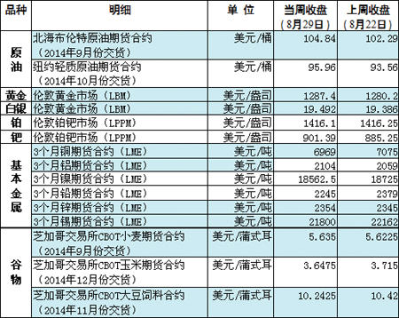 國際大宗商品期貨價(jià)格明細(xì)表[2014-9-1]