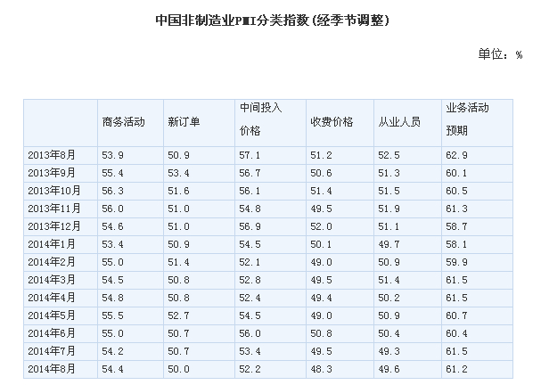 2014年8月中國(guó)非制造業(yè)商務(wù)活動(dòng)指數(shù)為54.4%